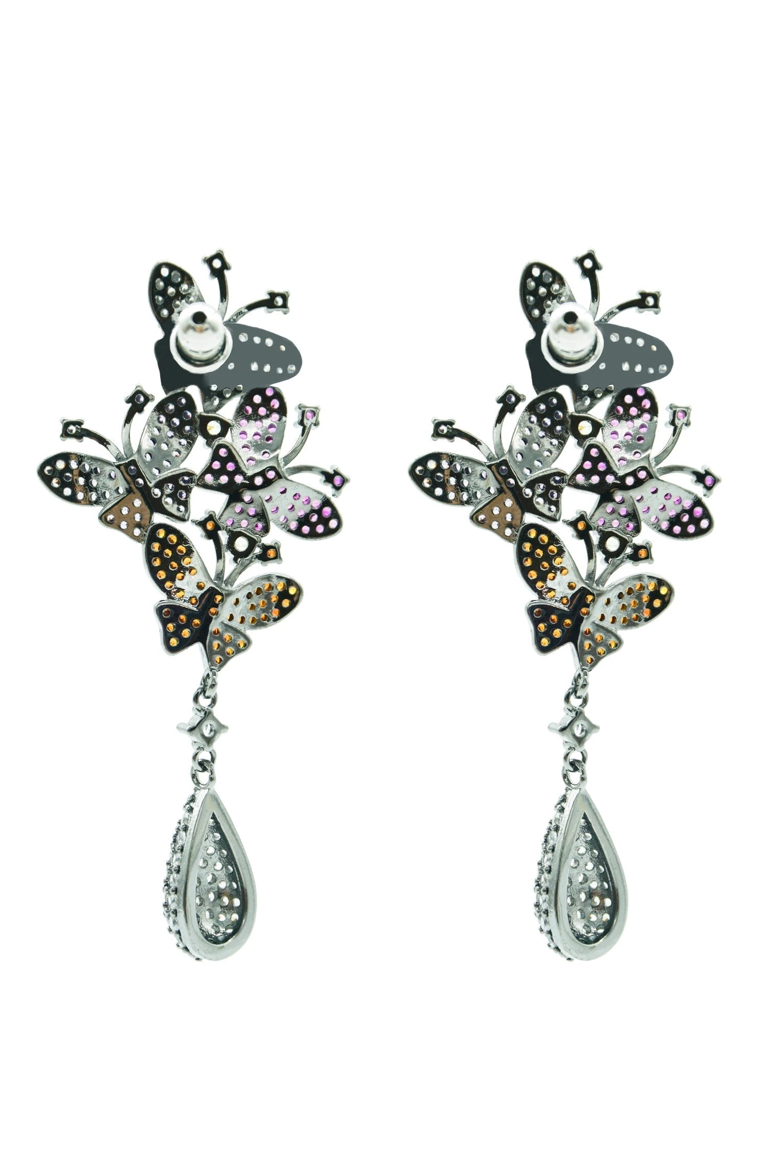 The Carlotta Earrings are bound to draw attention with any look. Rendered from silver hardware and encrusted with an array of multicolored diamantes. This design features a cluster of delicate butterflies for a feminine aesthetic.