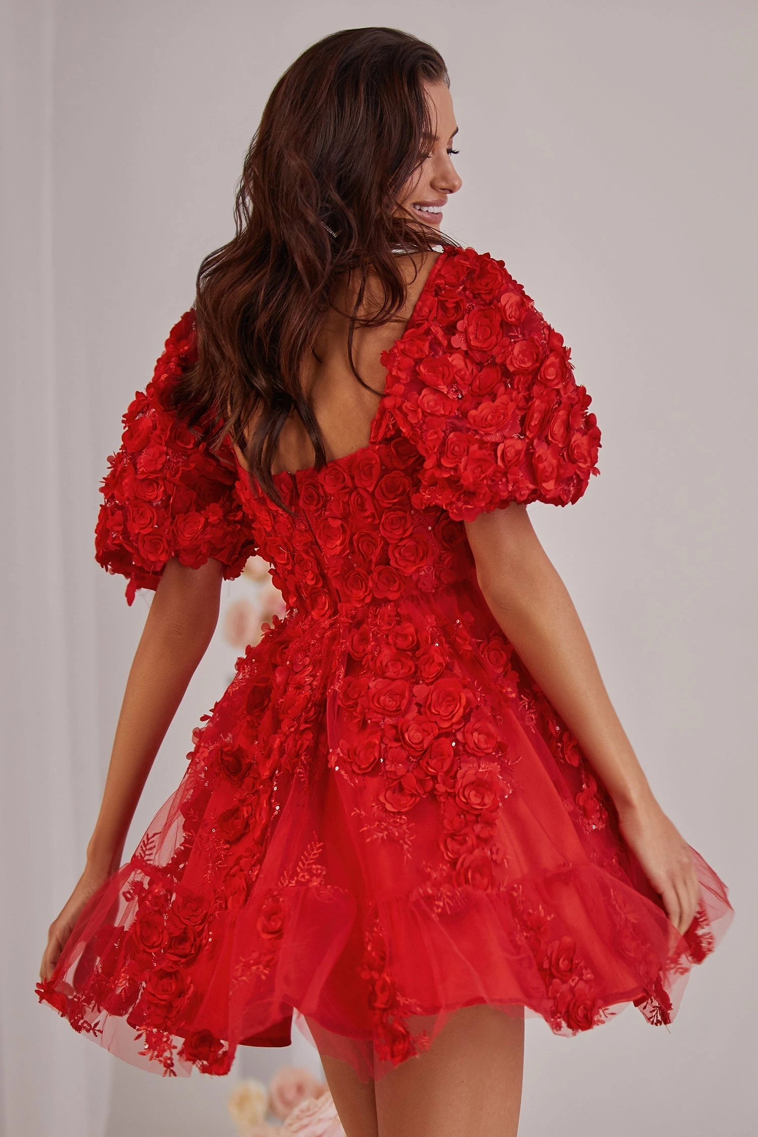 With each romantic detail, we introduce the Coraline Dress. Mini in length and crafted from a luxurious 3D floral fabric, this dress encapsulates the love we desire. Created with a straight neckline, puff sleeves, and an a-line silhouette. The Coraline Dress was made to capture all the attention.