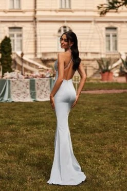 Cotton poplin fabric, no stretch, halter neck, button back, no elastic around waist, lined.