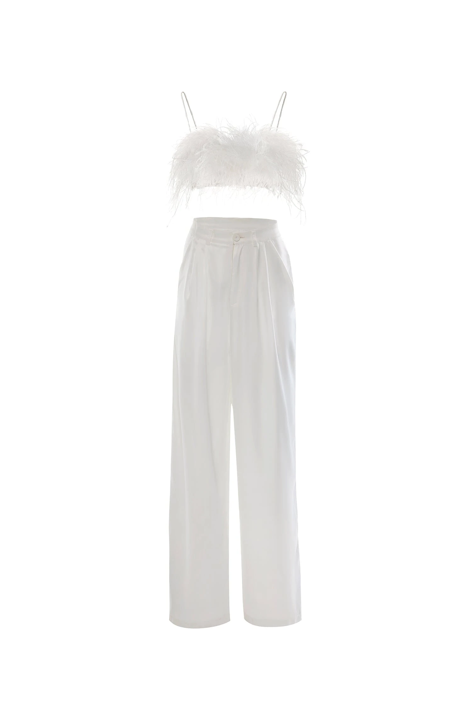 Modernise your style with the Hilma Set. Suspended from dainty straps, this feather crop is a season favourite. Paired with high-waisted palazzo-style pants, this set opts for a super chic look.