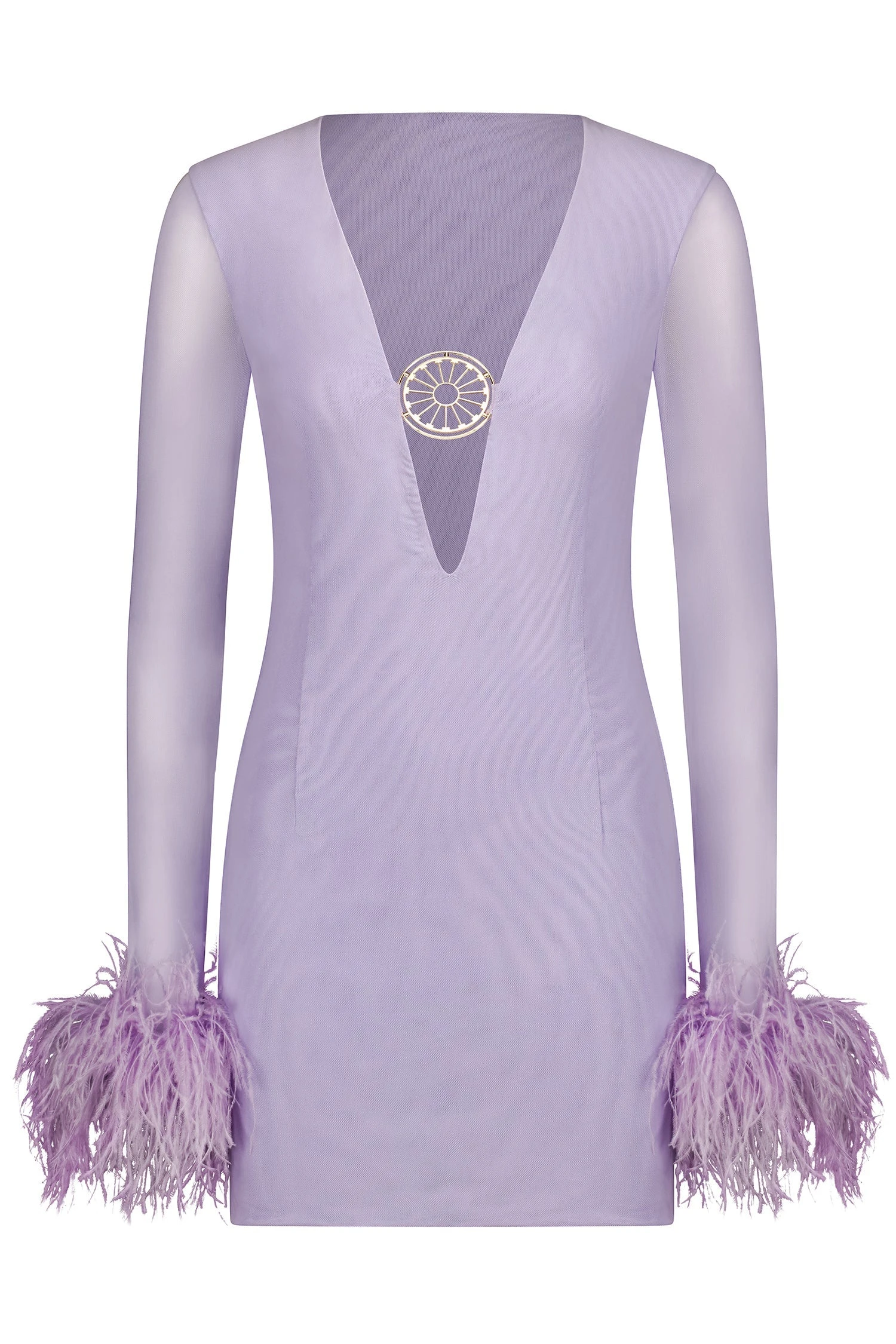 Elevate your wardrobe with the Jessica Dress. This alluring piece features long sleeves with feather cuffs, a daring plunge neckline embellished with our signature Alamour emblem. Designed with a flattering fitted midi silhouette and crafted from a delightful lilac mesh fabric. The Jessica Dress uses feathers and bold colours to elevate simple silhouettes.