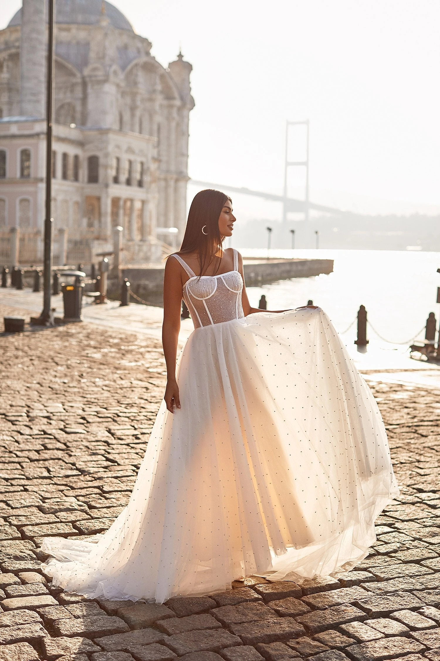 The Jubaila Gown is the perfect median for those brides that want a traditional look with added modern design elements. Rendered from a delicate tulle fabric adorned with pearls and adjusted with a lace-up back, these details bring out a conventional look for your special day while still adding the sheer bodice and ruched bust to accentuate the contemporary taste.