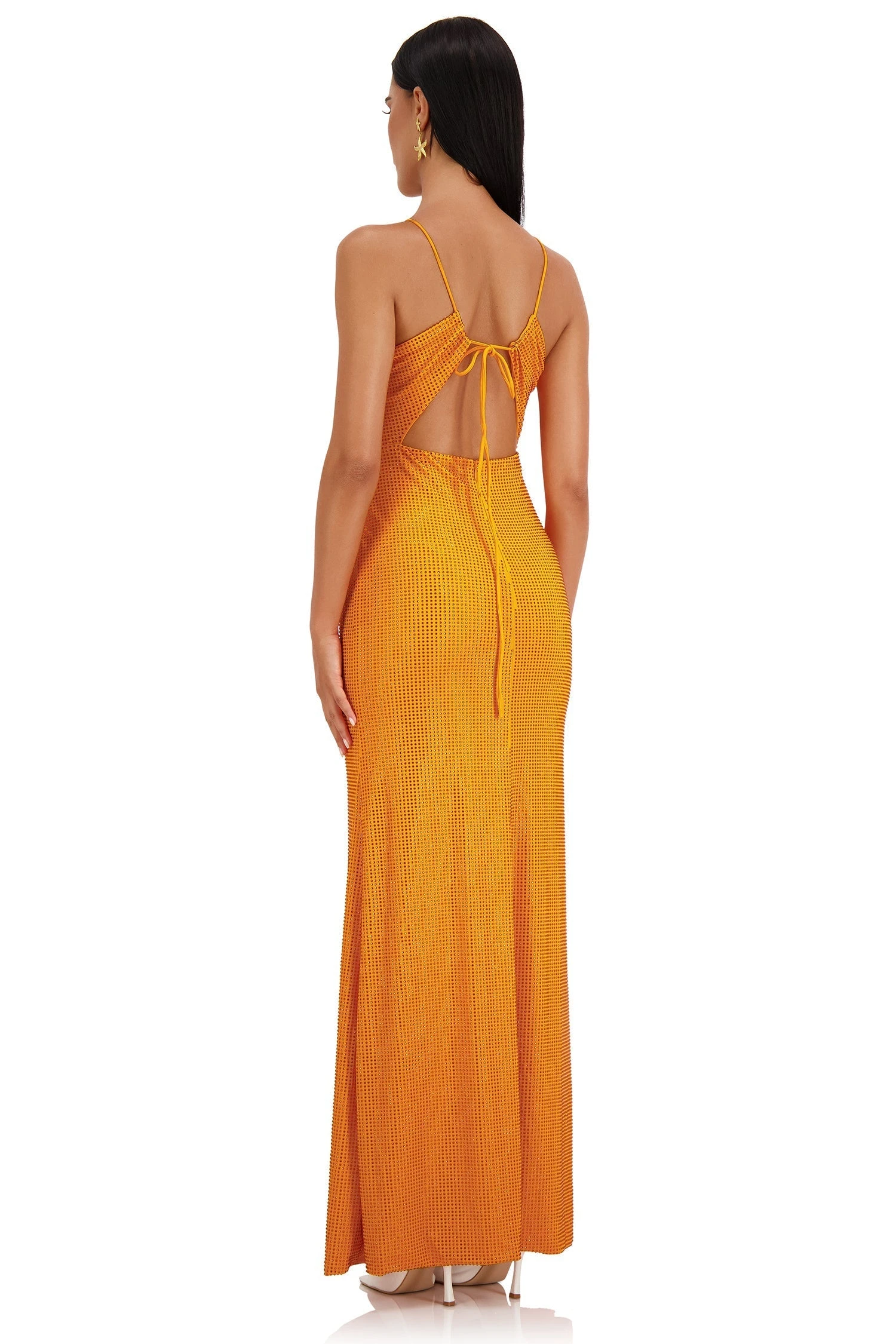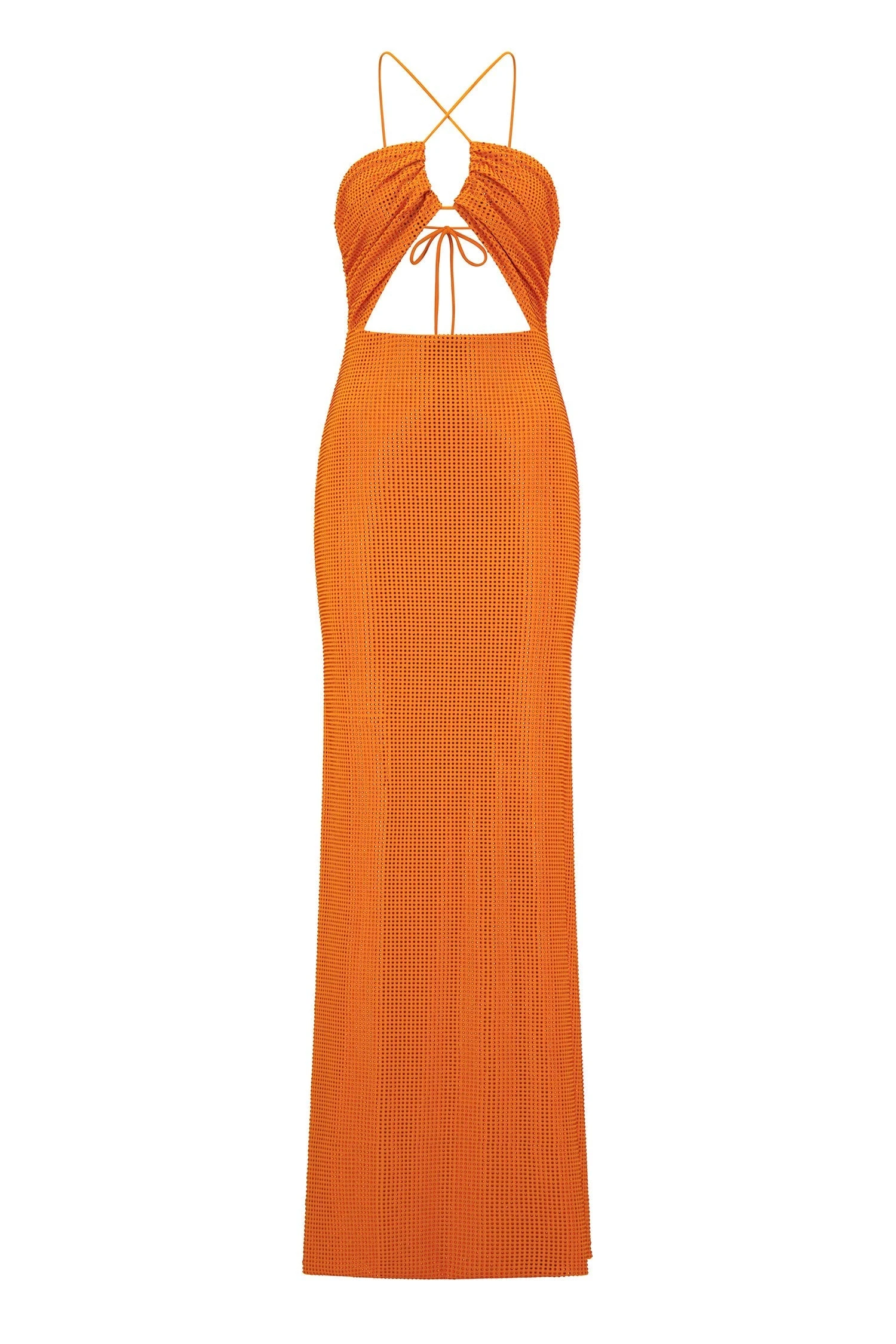 Step into luxury with the Miuccia Dress. In a striking orange hue and adorned with diamante embellishments, this dress features a bodice cut-out, halter neckline, and a fitted midi silhouette. The Miuccia Dress sets the tone for glamorous occasions.