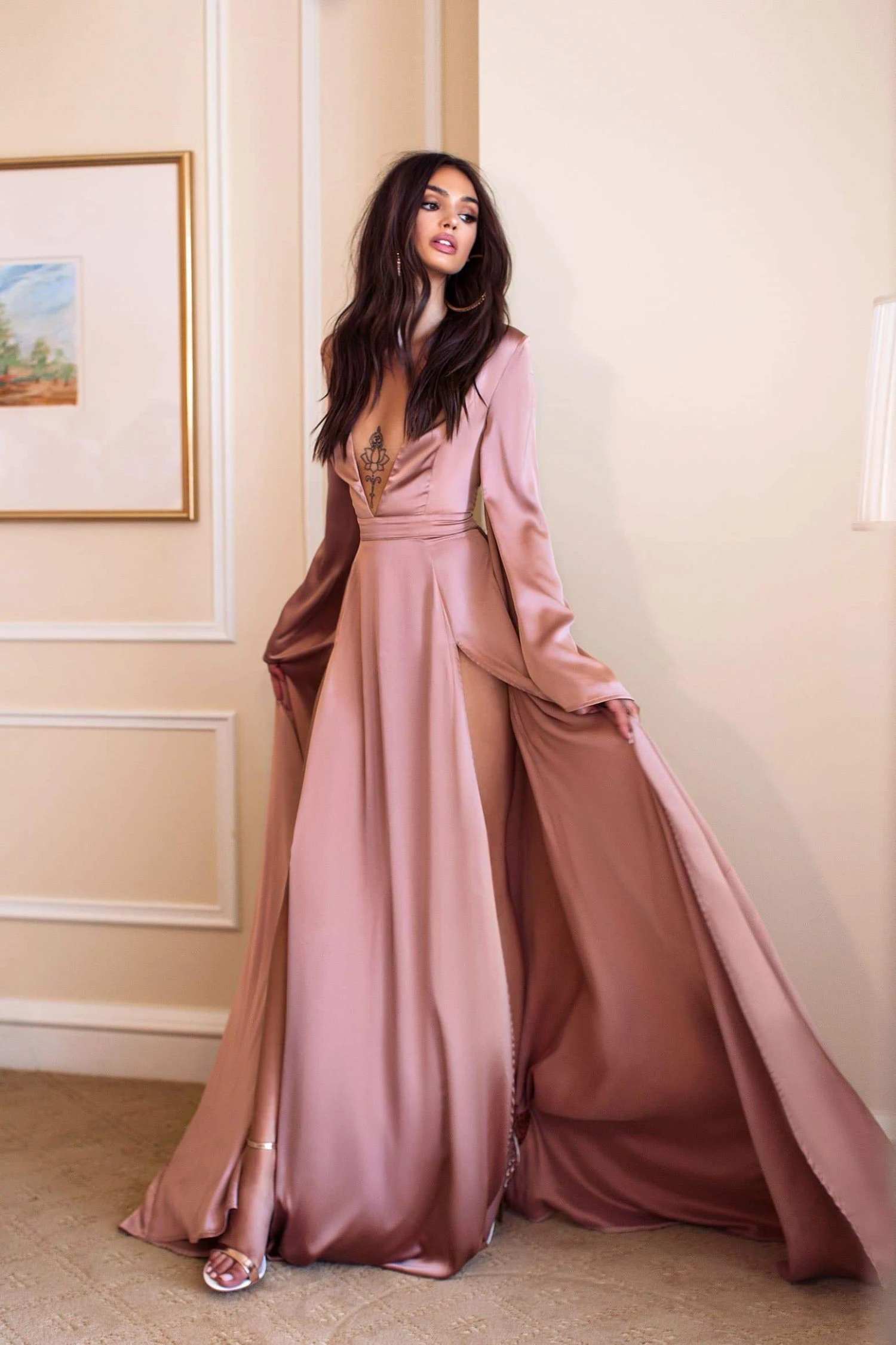 Get that WOW factor in the Olesya gown. Made from gorgeous satin fabric, the dress features long flare sleeves, a plunge v-neckline, an in built belt, two sexy thigh high slits and a long flowing train. Be the centre of attention in Olesya.