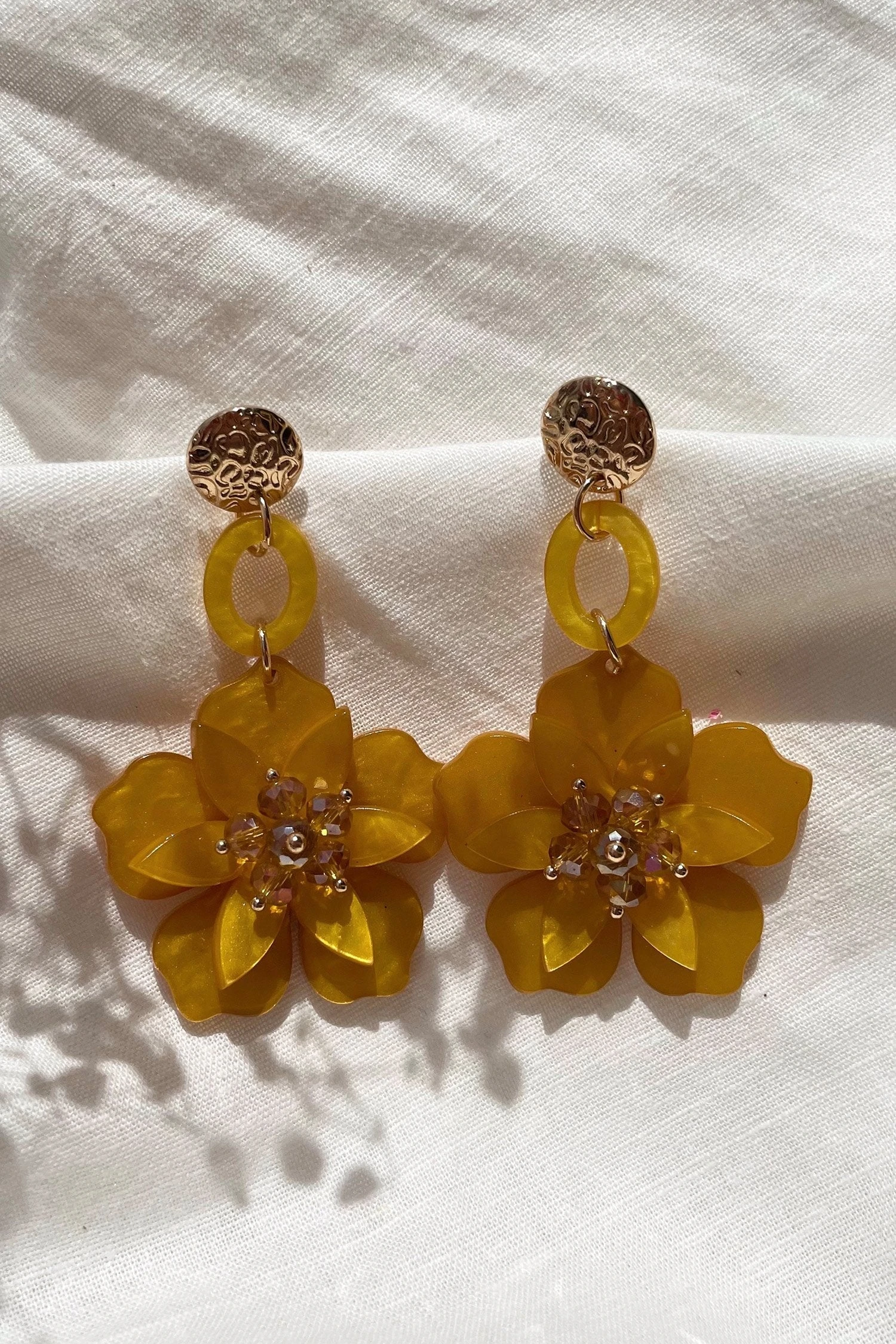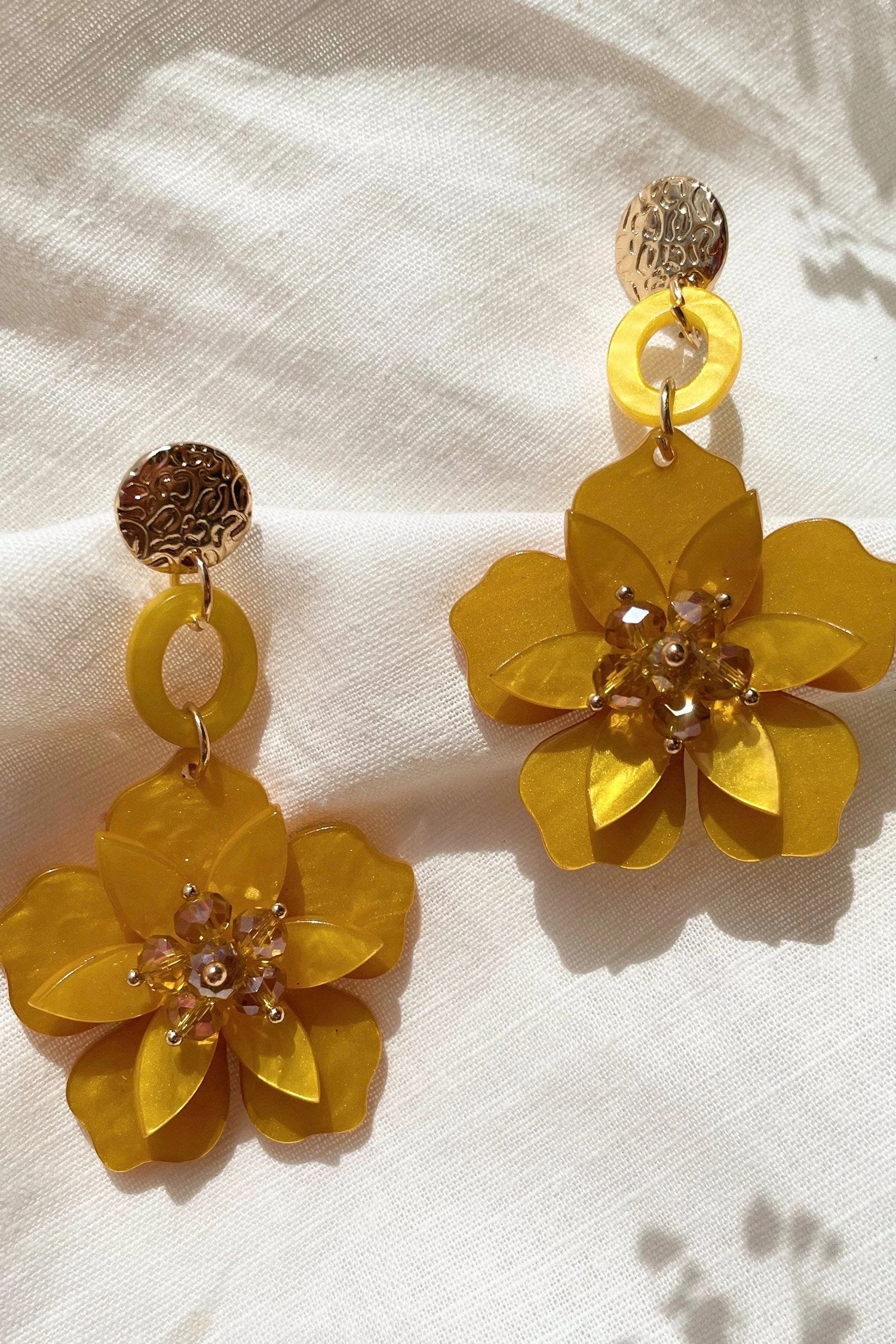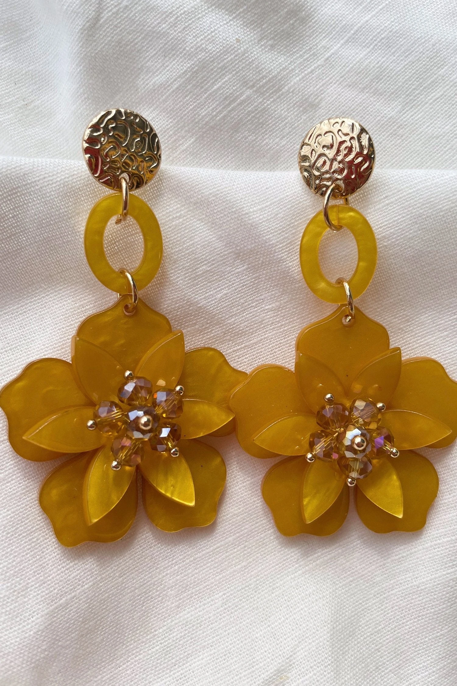 The Petra Mustard Flower Drop Earrings will pair perfectly with your resort wear. Crafted from an acrylic material in a mustard tone and elevated with an amber-colored center. These gold studded flower earrings will tie your spring wardrobe together.