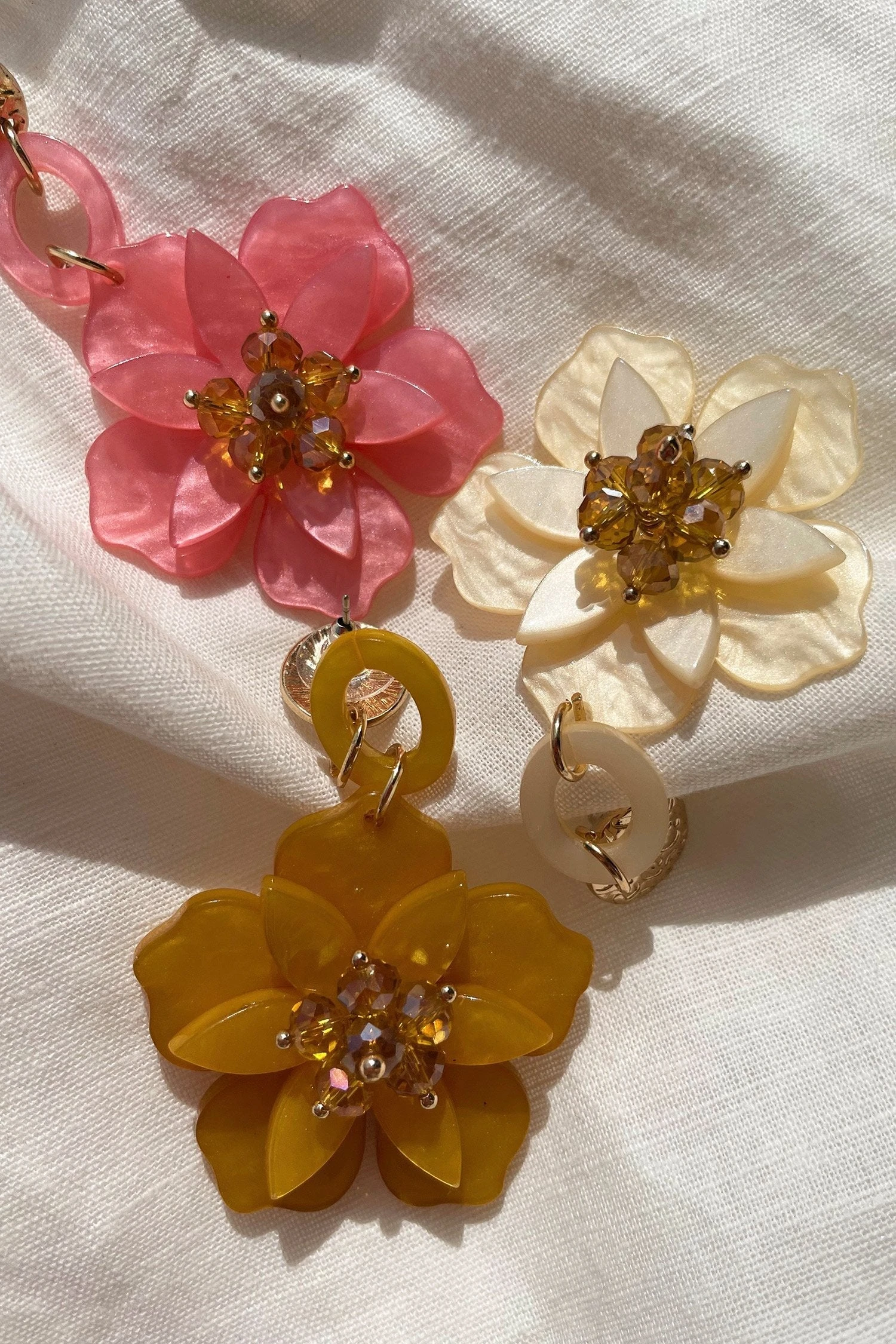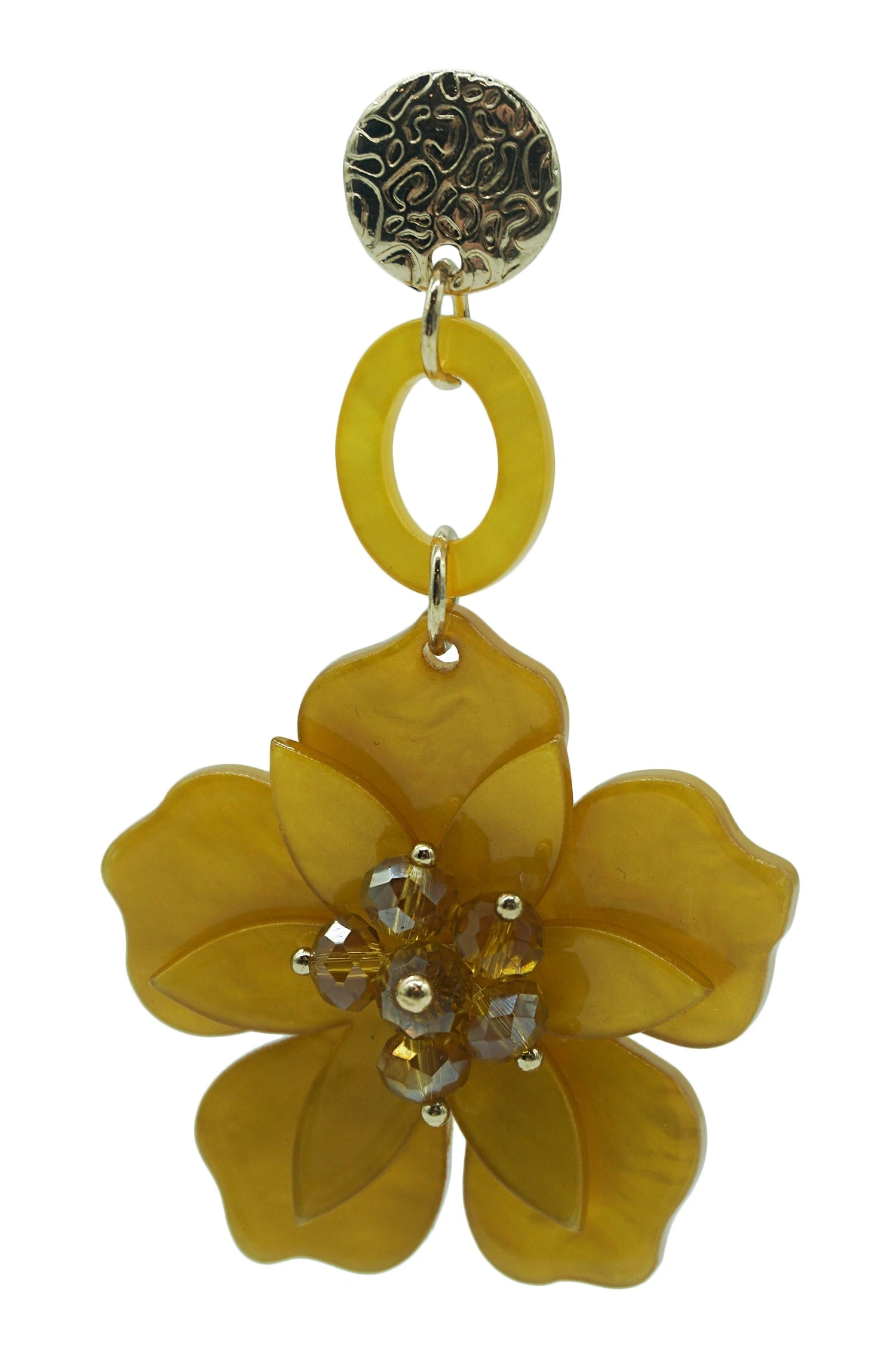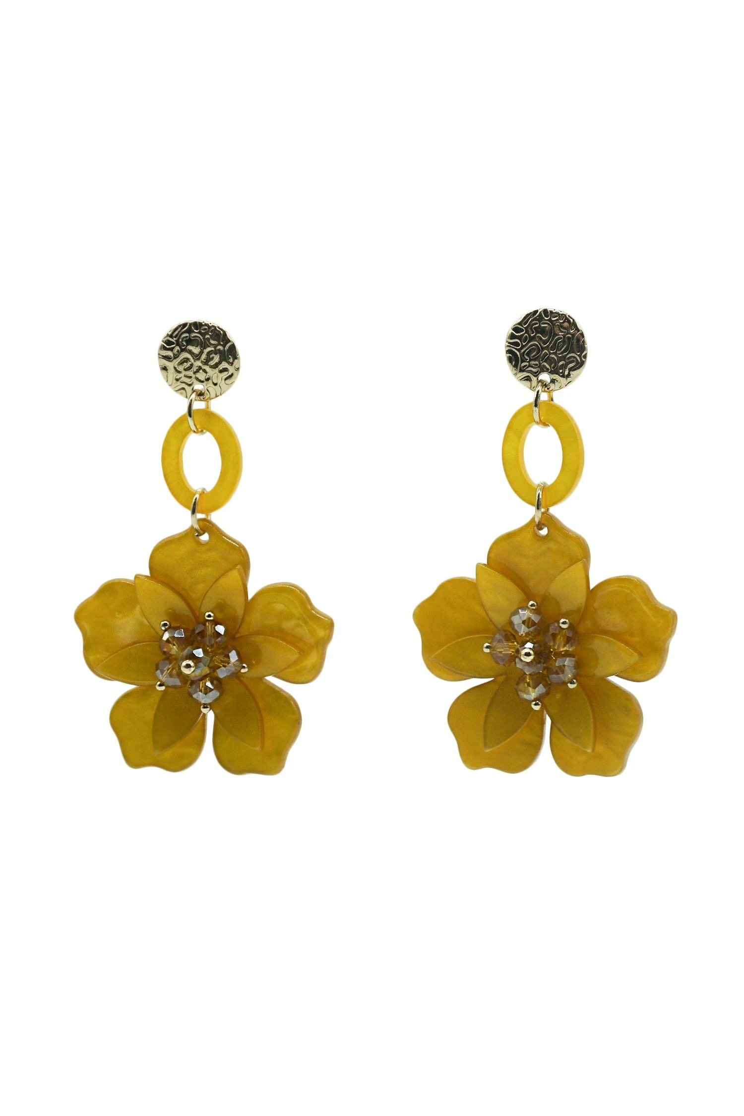 The Petra Mustard Flower Drop Earrings will pair perfectly with your resort wear. Crafted from an acrylic material in a mustard tone and elevated with an amber-colored center. These gold studded flower earrings will tie your spring wardrobe together.